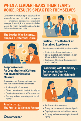 إذ إن الموظف الذي يحترم، والمقترح الذي يستمع إليه، والملاحظة التي تناقش بعقلانية — كل ذلك ينتج بيئة عملٍ تفيض بالإبداع والإنتاجية. وما أروع التحول حين يرى القائد نتائج مذهلة بمجرد تغير الأسلوب من ردودٍ بيروقراطية إلى تفاعلٍ إنسانيٍ حقيقي.