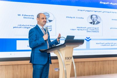 وتناول “العجوري” خلال الورشة عددًا من المحاور، أبرزها: أهمية ضبط الجودة، وفوائد تبنّي نظام إدارة الجودة في تحسين مستوى الخدمات واستثمار الفرص، ودور مشاركة الموظفين والعاملين في تعزيز كفاءة تنفيذ الأعمال، كما استعرض معايير الجودة ونماذج التميّز المؤسسي العالمية، بالإضافة إلى أبرز الوسائل والأدوات المستخدمة في إدارة الجودة، ومجالات توظيف الذكاء الاصطناعي لدعم رحلات التطوير والتحسين في الجهات المؤسسية