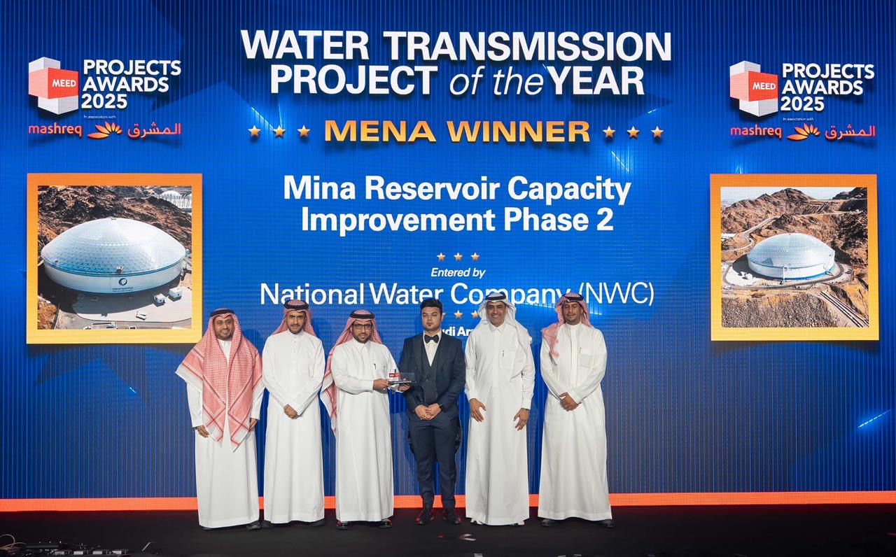حصدت شركة المياه الوطنية جائزتي أفضل مشروع مياه على مستوى المملكة وعلى مستوى الشرق الأوسط وشمال أفريقيا عن مشروعها ( إنشاء خزان 190 ألف م3 في المشاعر المقدسة) في انجاز وطني جديد يسجل للشركة وذلك خلال حفل جوائز ميد 2025 للمشاريع في دولة الامارات العربية المتحدة ويعتبر الخزان من أكبر خزانات المياه الحديدية على مستوى العالم حيث تم تنفيذه بإستخدام كميات تصل إلى 3200 طن من الحديد بهدف رفع الكفاءة التشغيلية وتعزيز عمليات توزيع المياه في المشاعر المقدسة لخدمة ضيوف الرحمن وحرصا على مواكبة التوسع في شبكات المياه وفقا للخطط الاستراتيجية وإكمال تنفيذ الخزان في وقتٍ قياسي يقدر بـ 75 يوما حيث كان العمل على مدار 24 ساعه يوميا وخلال فتره العمل المقدره ب 1800ساعة عمل لم يتم تسجيل اي إصابات او حوادث مما يعكس حرص الشركة على اتباع إجراءات السلامة المهنية في تنفيذ أعمالها .