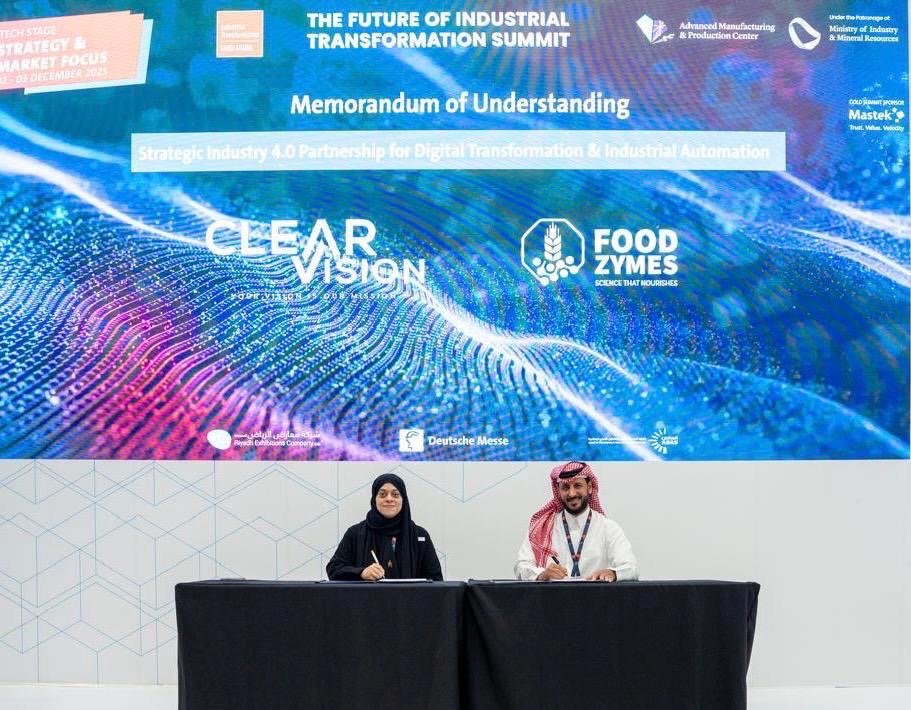 شهد معرض ومؤتمر التحول الصناعي السعودي (Industrial Transformation Saudi Arabia 2025) الذي يُقام برعاية وزارة الصناعة والثروة المعدنية وتنظّمه Hannover Messe توقيع اتفاقية شراكة استراتيجية بين شركتي ClearVision وFoodZymes تحت عنوان : شراكة استراتيجية في الثورة الصناعية الرابعة للتحول الرقمي والأتمتة الصناعية وتسعى هذه الشراكة إلى تمكين المنشآت الصناعية من تبني أحدث حلول التحول الرقمي وتطبيق تقنيات الثورة الصناعية الرابعة (Industry 4.0) وتعزيز كفاءة الأتمتة الصناعية بما يُسهم في رفع مستوى الإنتاجية وتقليل التكاليف التشغيلية ودعم مستهدفات رؤية المملكة 2030 في تطوير القطاع الصناعي .