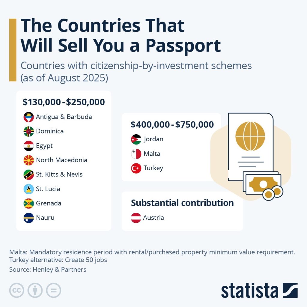 في عالم يتسم بالتحولات السريعة والفرص المتعددة، تُقدم بعض الدول جوازات سفرها للبيع، مما يمنح الراغبين في الحصول على جنسية جديدة فرصة السفر بحرية أكبر. وفقًا لشركة المحاماة “هينلي وشركاؤه”، تقدم 12 دولة حول العالم برامج تمنح الجنسية مقابل الاستثمارات، بلا شروط معقدة تتعلق بالإقامة أو الزيارة.