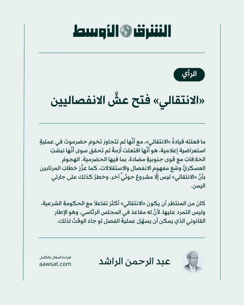 لا يتعامل مقال «الانتقالي فتح عشّ الانفصاليين» للكاتب عبدالرحمن الراشد، مع التطورات في جنوب اليمن بوصفها حدثًا ميدانيًا عابرًا، ولا يقرأ تحركات المجلس الانتقالي من زاوية عاطفية أو أيديولوجية، بل يضعها ضمن معادلة سياسية صلبة تحكمها الجغرافيا والديموغرافيا قبل الشعارات والبيانات.
