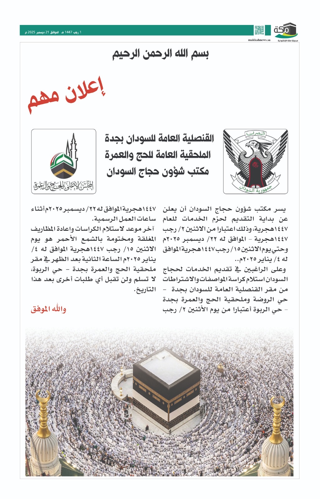 وعلى الراغبين في تقديم الخدمات لحجاج السودان استلام كراسة المواصفات والاشتراطات من مقر القنصلية العامة للسودان بجدة – حي الروضة وملحقية الحج والعمرة بجدة – حي الربوة أعتبارا من يوم الأثنين 2/ رجب 1447هجرية الموافق له 22/ ديسمبر 2025م أثناء ساعات العمل الرسمية.