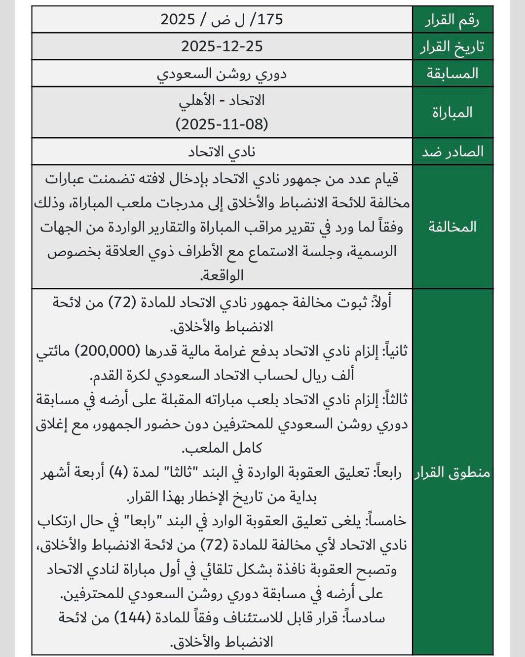 واستكملت: “يُلغى تعليق العقوبة الوارد في البند (رابعًا) في حال ارتكاب نادي الاتحاد أي مخالفة للمادة (72) من لائحة الانضباط والأخلاق، وتصبح العقوبة نافذة تلقائيًا في أول مباراة لنادي الاتحاد على أرضه في مسابقة دوري روشن السعودي للمحترفين”، مشيرة إلى أن القرار قابل للاستئناف وفقًا للمادة (144) من لائحة الانضباط والأخلاق.