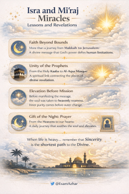 فالإسراء والمعراج ليست ذكرى تزار في التقويم ثم تترك بل “خارطة طريق” .. إعجاز يثبت اليقين وتشريع يربي الإنسان ودروس تعيد المعنى للألم وتحول الضيق إلى قرب. فإذا ثقل عليك حمل أو ضاقت عليك الدنيا تذكر: إن رب السماء الذي أسرى بنبيه ﷺ قادر أن يسري بك من همك إلى سكينتك .. وأن يجعل من سجدة صادقة معراجًا من نور