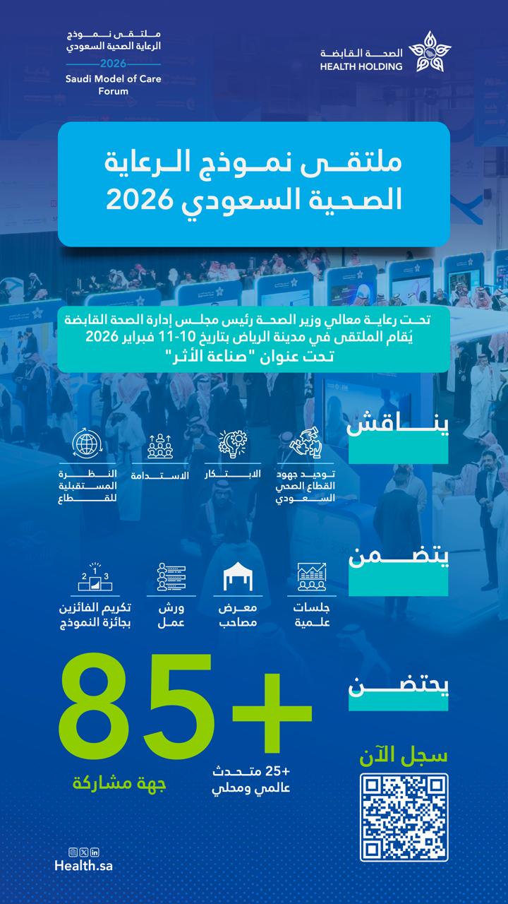 تحت رعاية معالي وزير الصحة رئيس مجلس إدارة الصحة القابضة الأستاذ فهد بن عبدالرحمن الجلاجل، ينطلق في مدينة الرياض ملتقى نموذج الرعاية الصحية السعودي 2026 في نسخته الثالثة، خلال يومي 9 و10 فبراير المقبل، والذي تنظمه الصحة القابضة، وسط حضور عدد من المتحدثين المحليين والدوليين، تحت عنوان “صناعة الأثر”.