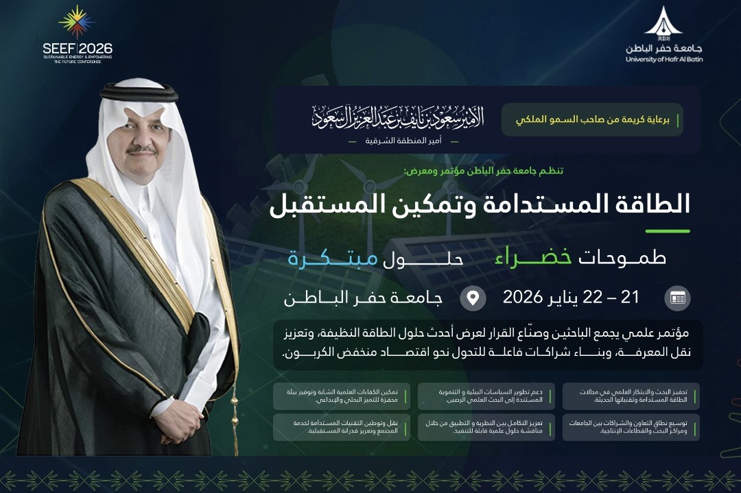 برعاية صاحب السمو الملكي الأمير سعود بن نايف بن عبدالعزيز آل سعود، أمير المنطقة الشرقية، تنظم جامعة حفر الباطن مؤتمر ومعرض الطاقة المستدامة وتمكين المستقبل SEEF2026 خلال الفترة 21-22 يناير 2026م، في مقر الجامعة بمحافظة حفر الباطن.