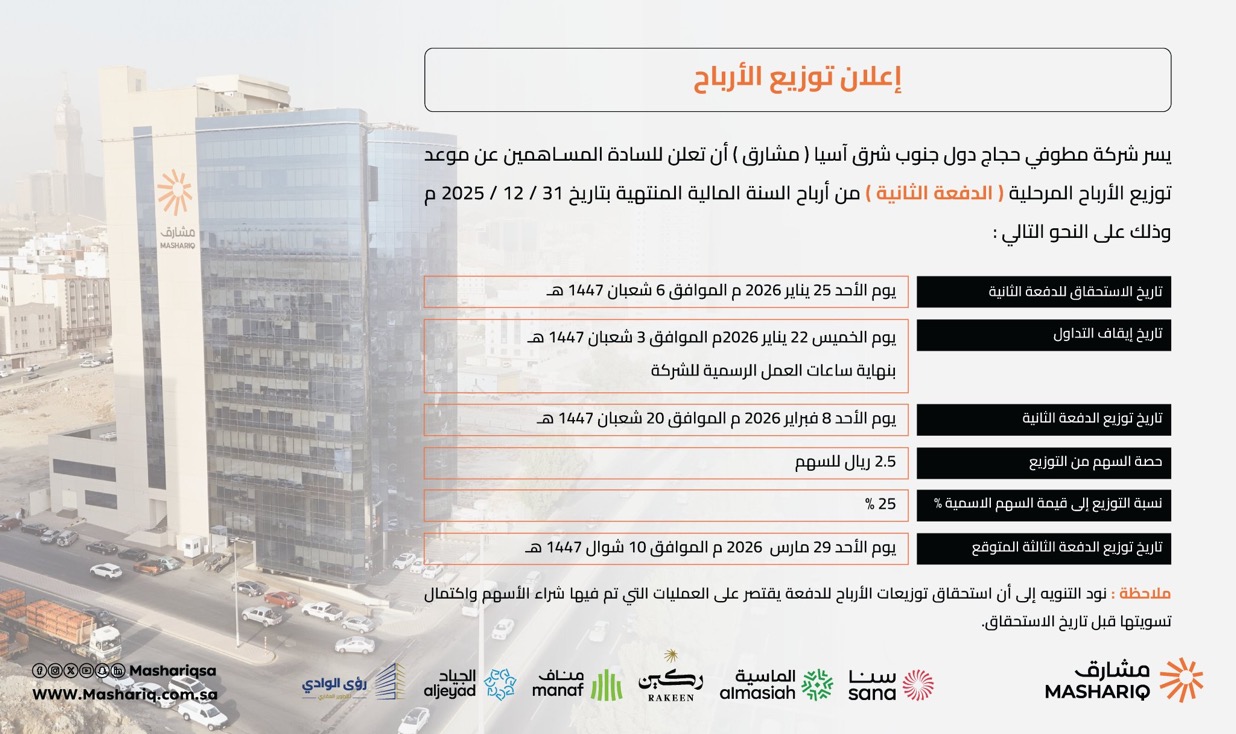 الرئيسية/«مشارق» تعلن موعد توزيع الأرباح المرحلية (الدفعة الثانية) عن أرباح عام 2025/IMG_5629 IMG_5629
