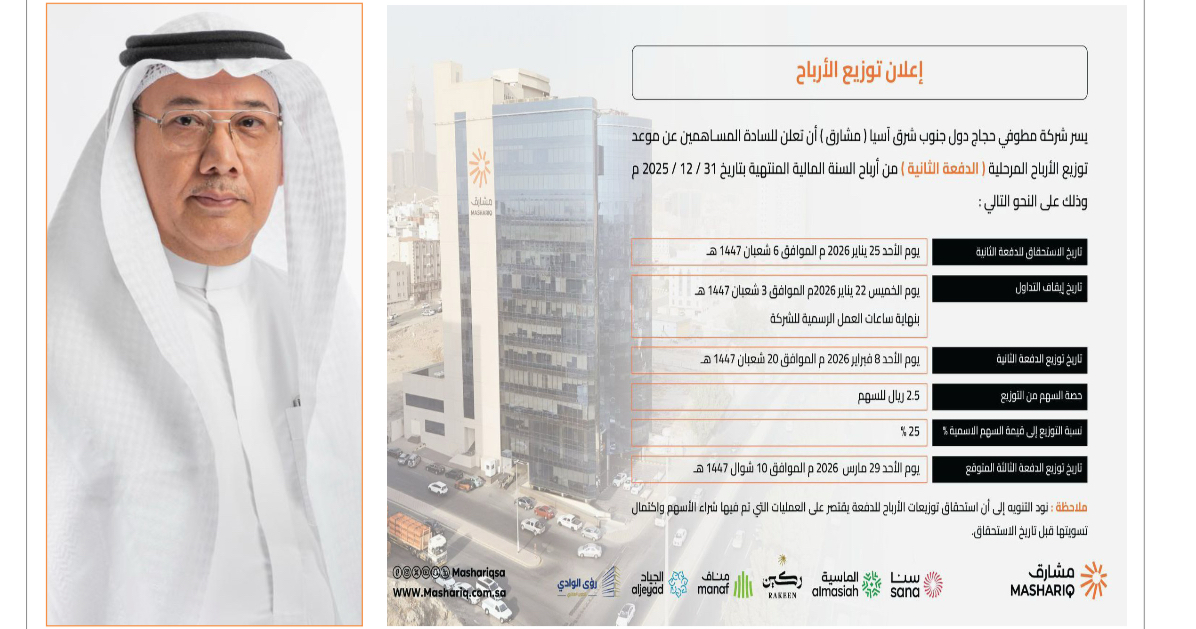 أعلنت شركة مطوفي حجاج دول جنوب شرق آسيا «مشارق» عن توزيع الأرباح المرحلية (الدفعة الثانية) عن أرباح السنة المالية المنتهية في 31 ديسمبر 2025م، في خطوة تعكس متانة المركز المالي للشركة واستقرار أدائها التشغيلي في قطاع خدمات الحج والعمرة.