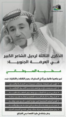 تمر هذه الأيام الذكرى الثالثة لوفاة الشاعر عطيه السوطاني –رحمه الله–، الذي يعتبر واحداً من الأسماء التي كتبت النجاح لنفسها في مجال العرضة الجنوبية، وقد ترك أثراً عميقاً في تاريخ الموروث حتى أصبح جزءاً لا يتجزأ من هويته، ويستعاد اسمه كنموذج لشاعر صنع شعبيته من خلال حضوره القوي وجرأته في المحاورات، متغلباً على التكتلات التي واجهته ومبتعداً عن ثنائيات بعض الشعراء، كما رفض المبالغة في المدح والثناء في الحفلات، مما جعله يبرز كشاعر مستقل فرض اسمه ومكانته بثقة وجدارة، وترك بصمة حماسية في مسيرة العرضة.