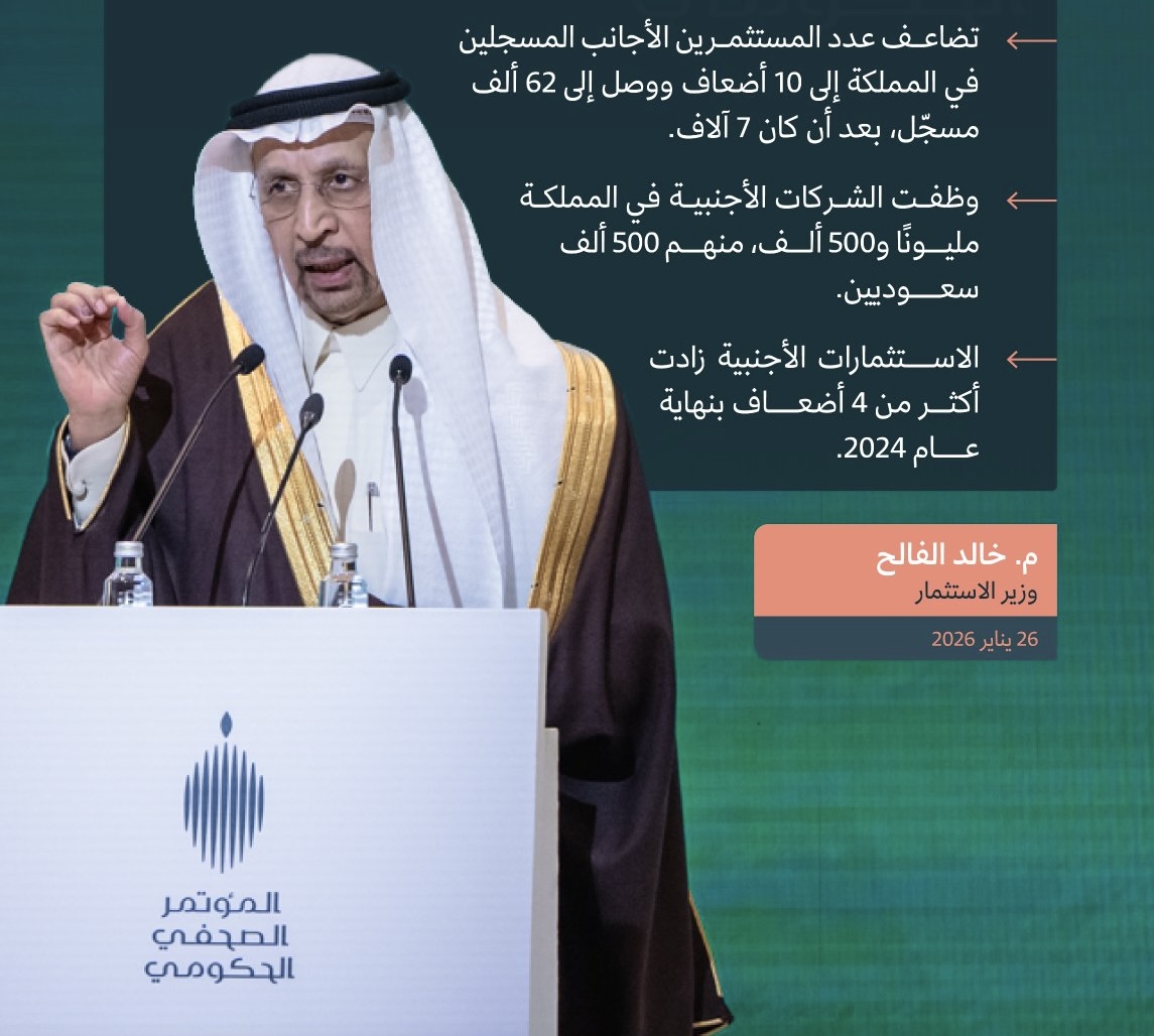 في المؤتمر الصحفي الحكومي الذي استضاف معالي وزير الاستثمار المهندس خالد الفالح، أجاب الوزير عن تساؤلات الإعلاميين حول تطورات المنظومة الاستثمارية والتحول الاقتصادي، متناولًا ملفات متعددة شملت دور صندوق الاستثمارات العامة في تحفيز القطاع الخاص، وتحديثات سوق المال السعودي، ونمو القطاع العقاري، ومسارات الاقتصاد الرقمي، وآليات قياس الأثر النوعي للاستثمار، إلى جانب رسائل طمأنة للمستثمرين الأجانب في ظل المتغيرات العالمية.