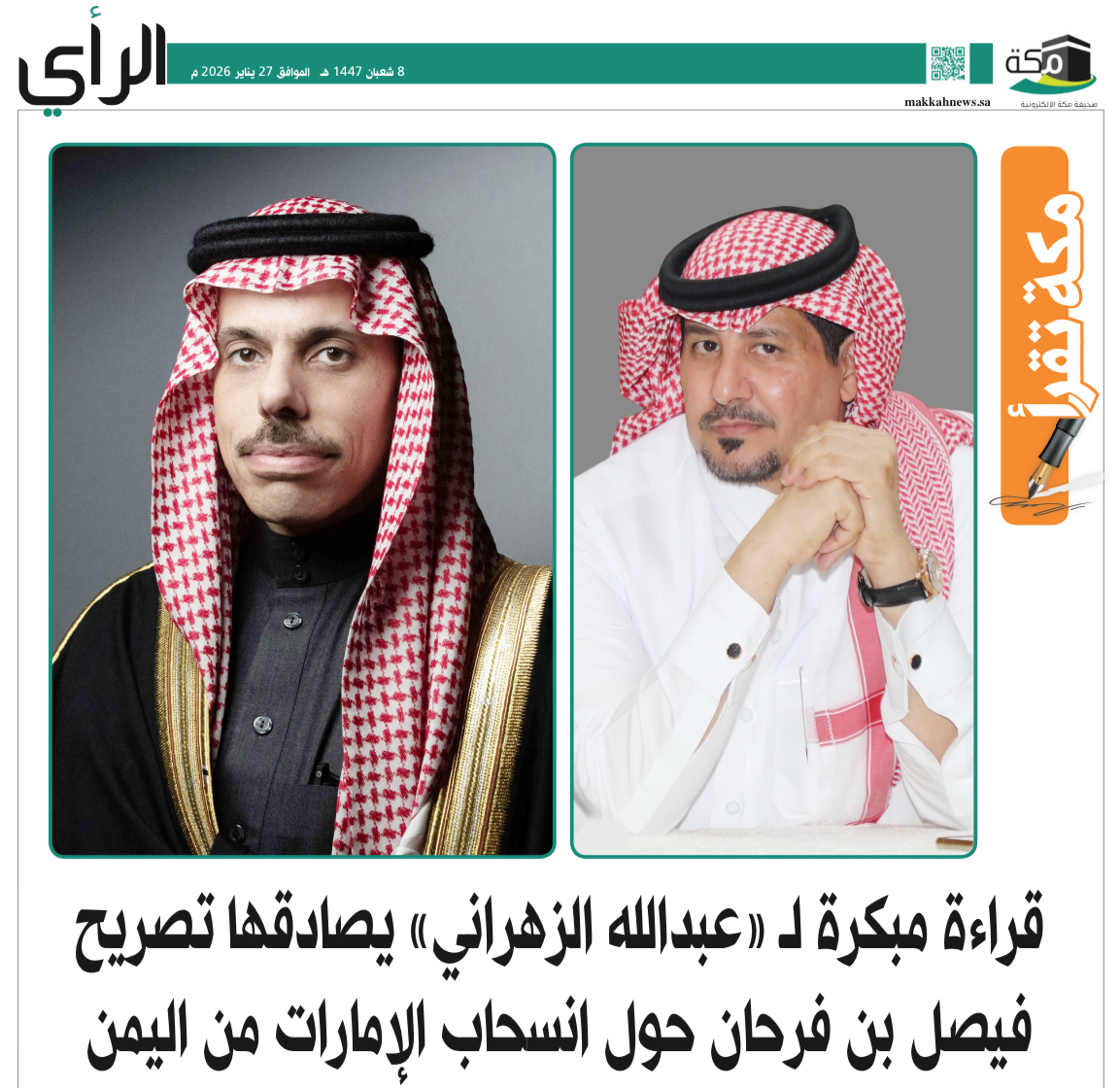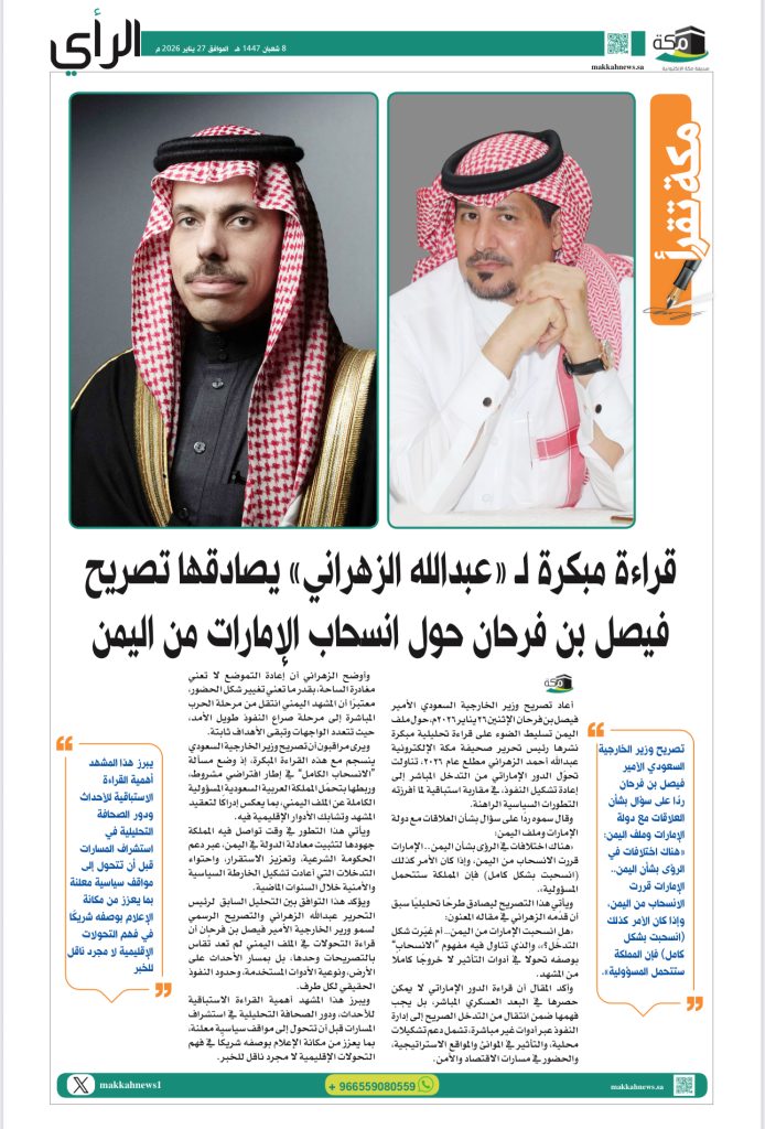 مكة – أعاد تصريح وزير الخارجية السعودي الأمير فيصل بن فرحان الإثنين 26 يناير 2026م، حول ملف اليمن تسليط الضوء على قراءة تحليلية مبكرة نشرها رئيس تحرير صحيفة مكة الإلكترونية عبدالله أحمد الزهراني مطلع عام 2026، تناولت تحوّل الدور الإماراتي من التدخل المباشر إلى إعادة تشكيل النفوذ، في مقاربة استباقية لما أفرزته التطورات السياسية الراهنة.