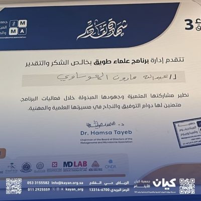 “الحمد لله الذي أكرمني بحضور البرنامج العلمي أنا وأختي مريم. كانت دورة مفيدة وجميلة تعلمت منها أشياء كثيرة، ونوّرت عقلي على مجالات لم أكن أتطرق لها سابقًا. كما ساعدتني في اختيار مساري وتخصصي المستقبلي، وتعلمت كيف أقف أمام الجمهور وأقدم ما تعلمته بثقة. أنا سعيد بفوزي بالتكريم والشهادة، وكل الشكر لجمعية كيان التي تحرص دائمًا على تمكيننا في جميع المجالات.”