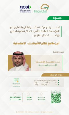 تنظم غرفة حفر الباطن غدا الثلاثء 2026/2/10م ، وبالتعاون مع المؤسسة العامة للتأمينات الاجتماعية لحضور ورشة بعنوان: أبرز ملامح نظام التأمينات الاجتماعية، والتي  يقدّمها قائد التوعية الأستاذ  محمد المنيف. الورشة تقام الساعة  11:00 صباحًا ،  عن بُعد عبر برنامج  “تيمز ” على الرابط :