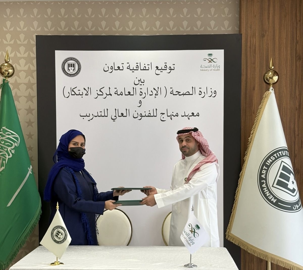 ومثل وزارة الصحة في توقيع الاتفاقية الأستاذ إبراهيم عسيري، نائب مدير مركز الابتكار بوزارة الصحة، بينما مثل المعهد الأستاذة هيفاء بنت منصور الجبيله، المدير العام لمعهد منهاج للفنون العالي للتدريب.
