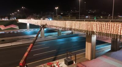 وشملت الأعمال تنفيذ أكثر من ١٢,٠٠٠ متر طولي من الستائر المضيئة على الجسور وجسور المشاة، إضافة إلى ١٥,٠٠٠ متر طولي من الإضاءات (الليد) على أعمدة الإنارة في عدد من الطرق والمحاور الرئيسة، كما جرى تركيب ٣٠ مجسمًا مضيئًا على شكل أهلة في الطرق والميادين العامة، إلى جانب أكثر من ٥٠ مجسمًا مضيئًا في الحدائق والمماشي، بما يعزز المشهد الجمالي ويهيئ بيئة احتفالية متكاملة.