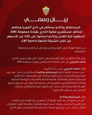 وسع البرتغالي كريستيانو رونالدو، قائد النصر، نشاطه الاستثماري في القطاع الرياضي بإعلانه دخول عالم ملكية الأندية من بوابة الكرة الإسبانية، بعدما استحوذ على 25% من أسهم ألميريا.
