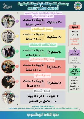 كما شارك 60 كشافاً في مسار تنظيم المصليات داخل المسجد الحرام وساحاته مسجلين 4,500 ساعة تطوعية، إلى جانب 30 كشافاً في مبادرة القاصد الصغير المعنية بالعناية بأطفال المعتمرين أثناء أداء ذويهم للنسك بإجمالي 2,250 ساعة تطوعية.