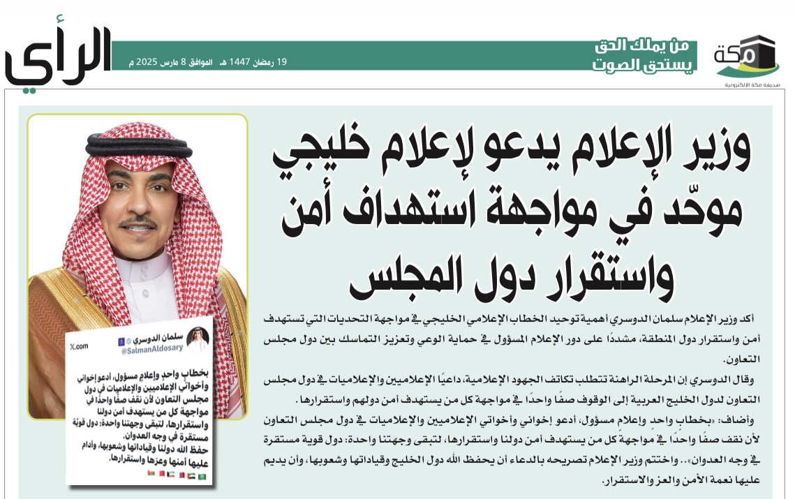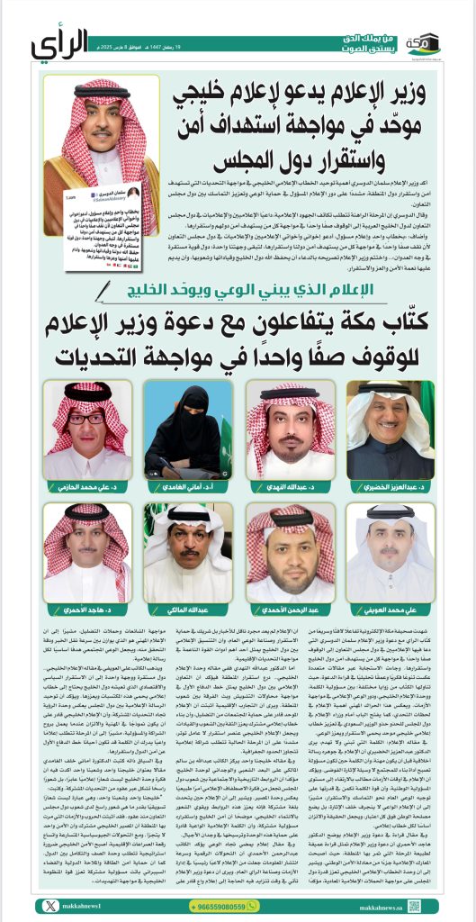 شهدت صحيفة مكة الإلكترونية تفاعلًا لافتًا وسريعًا من كتّاب الرأي مع دعوة وزير الإعلام سلمان الدوسري التي دعا فيها الإعلاميين في دول مجلس التعاون إلى الوقوف صفًا واحدًا في مواجهة كل من يستهدف أمن دول الخليج واستقرارها. وجاءت الاستجابة عبر مقالات متعددة عكست تنوعًا فكريًا وعمقًا تحليليًا في قراءة الدعوة، حيث تناولها الكتّاب من زوايا مختلفة؛ بين مسؤولية الكلمة، ووحدة الإعلام الخليجي، ودور الوعي الإعلامي في مواجهة الأزمات. ويعكس هذا الحراك المهني أهمية الإعلام في لحظات التحدي، كما يفتح الباب أمام وزراء الإعلام في دول المجلس للحذو حذو الوزير السعودي في تعزيز خطاب إعلامي خليجي موحد يحمي الاستقرار ويعزز الوعي.