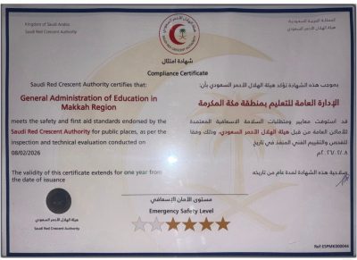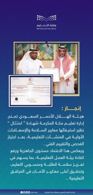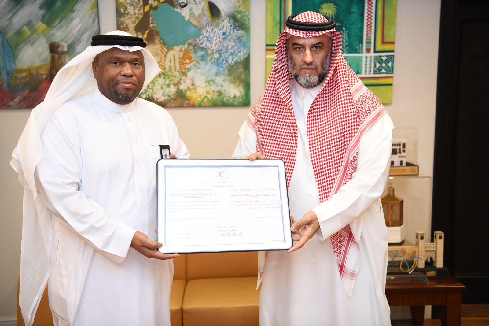 حصلت الإدارة العامة للتعليم بمنطقة مكة المكرمة على شهادة الامتثال من هيئة الهلال الأحمر السعودي، وذلك بعد استيفائها معايير السلامة والإسعافات الأولية المعتمدة في الأماكن العامة، واجتيازها الفحص والتقييم الفني الذي أُجري مؤخرًا.