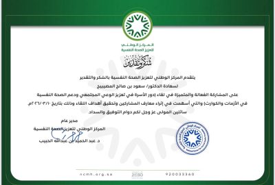 الرياض- قدّم المركز الوطني لتعزيز الصحة النفسية شكره وتقديره لسعادة الدكتور سعود بن صالح المصيبيح، نظير مشاركته الفاعلة والمتميزة في لقاء بعنوان «دور الأسرة في تعزيز الوعي المجتمعي ودعم الصحة النفسية في الأزمات والكوارث».