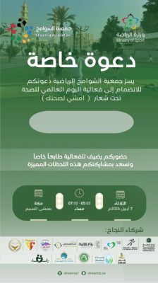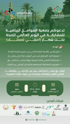 تنظم جمعية الشوامخ الرياضية، وبالتعاون مع وزارة الرياضة وعدد من شركاء النجاح، فعالية مجتمعية مميزة بمناسبة اليوم العالمي للصحة، وذلك عصر يوم الثلاثاء 7 أبريل 2026م، في ممشى النسيم بمكة المكرمة، تحت شعار “امشِ لصحتك”.