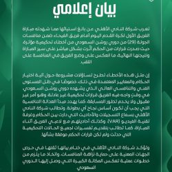 أصدر النادي الأهلي بيانًا رسميًا أعرب خلاله عن استيائه من الأخطاء التحكيمية التي شهدتها مباراته أمام الفيحاء، ضمن منافسات الدوري