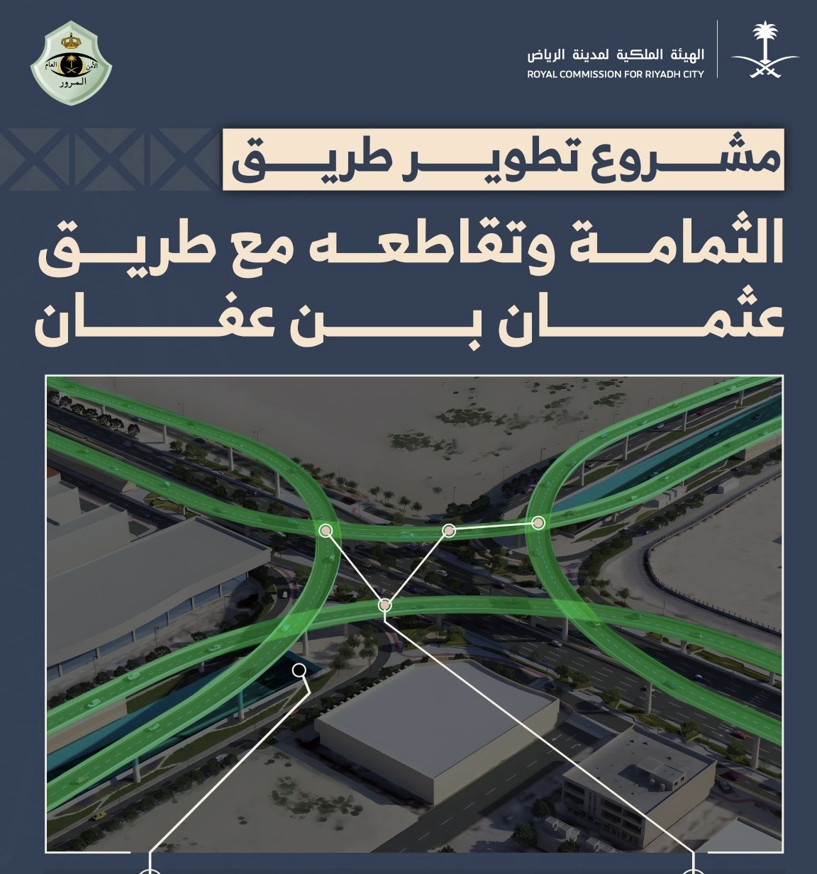 أعلنت الهيئة الملكية لمدينة الرياض عن تنفيذ نفق طريق الثمامة والجسور العلوية عند تقاطعه مع طريق عثمان بن عفان، والذي يتضمّن تنفيذ نفق على طريق الثمامة بطول 850 مترًا، إلى جانب إنشاء أربعة جسور علوية بأطوال إجمالية تقارب 2000 متر، وذلك ابتداء من يوم الخميس 16 أبريل 2026م، بما يسهم في تحسين حركة التنقُّل بين الاتجاهات المختلفة، وتعزيز الترابط بين المحاور الحيوية، وذلك ضمن أعمال برنامج تطوير محاور الطرق الدائرية والرئيسية.