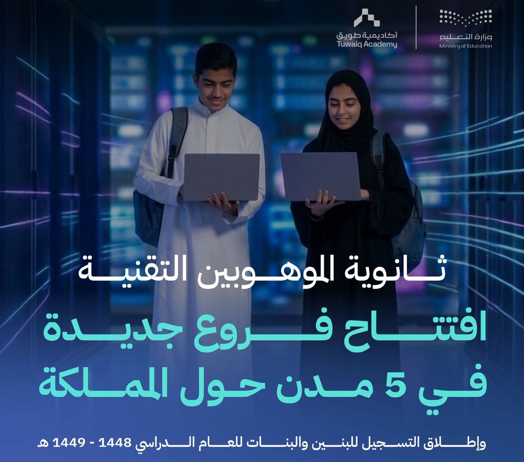 أعلنت مدارس الموهوبين التقنية الثانوية، بالشراكة بين وزارة التعليم وأكاديمية طويق، عن افتتاحها فروعًا جديدة في 5 مدن، وهي: مكة المكرمة والأحساء وأبها وجازان وحائل، إلى جانب فروعها الحالية في الرياض وجدة والدمام والقصيم والمدينة المنورة، وإطلاق التسجيل للعام الدراسي 1449/1448هـ، للبنين والبنات بالصف الأول الثانوي، وتُعد المدارس نموذجًا رائدًا والأولى من نوعها على مستوى العالم في بناء القدرات الوطنية في التقنيات المتقدمة.
