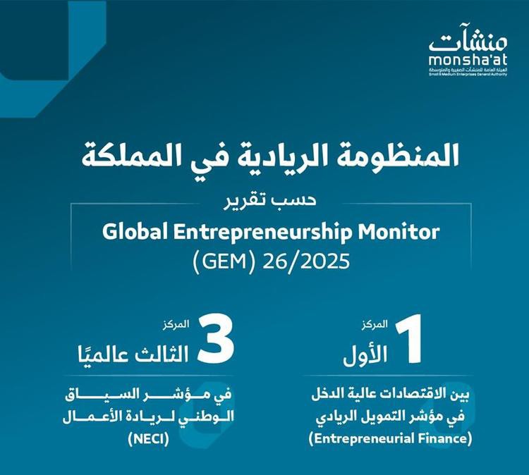 وتصدّرت المملكة الاقتصادات عالية الدخل عالميًا في مؤشر التمويل الريادي (Entrepreneurial Finance) لعام 2025، في تأكيد على كفاءة البيئة التمويلية وتطور أدوات دعم المنشآت الصغيرة والمتوسطة، بما يسهم في تسهيل وصولها إلى مصادر التمويل وتعزيز نموها واستدامتها؛ كما حققت المملكة المركز الثالث عالميًا في مؤشر السياق الوطني لريادة الأعمال (NECI)، ما يضعها ضمن الاقتصادات الأكثر تقدمًا في تهيئة البيئة الممكنة لريادة الأعمال، ويعزز مكانتها كوجهة جاذبة للاستثمار الريادي على مستوى العالم.