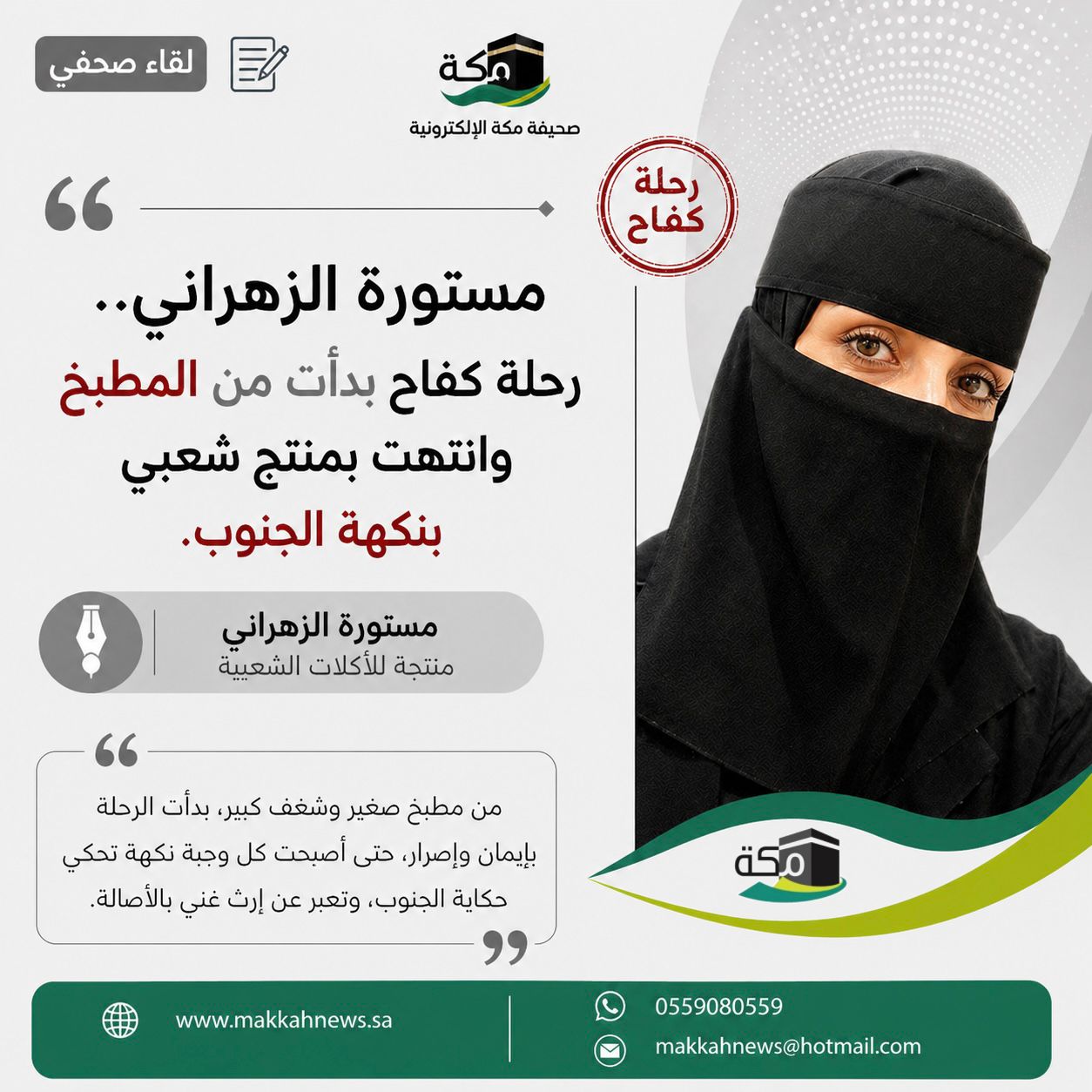 مستورة الزهراني إحدى بنات هذا الوطن الغالي التي تفتخر بماضيه الجميل وحاضره المجيد ،سيدة من سيدات الأسر المنتجة تقدم أكلات جنوبية بطابع تراثي أصيل وبلمسة منزلية يهواها الجميع.