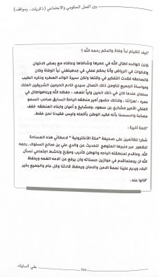 كما لا يمكن إغفال الكتاب الذي طُبع مؤخرًا بعنوان :« بين العمل الحكومي والاجتماعي .. ذكريات ومواقف »، والذي وصلني منه نسخة مهداة(٢)، فكان بمثابة نافذة إضافية على تجربة إنسانية ثرية، كُتبت بصدقٍ نادر، ووعيٍ توثيقي عميق.
