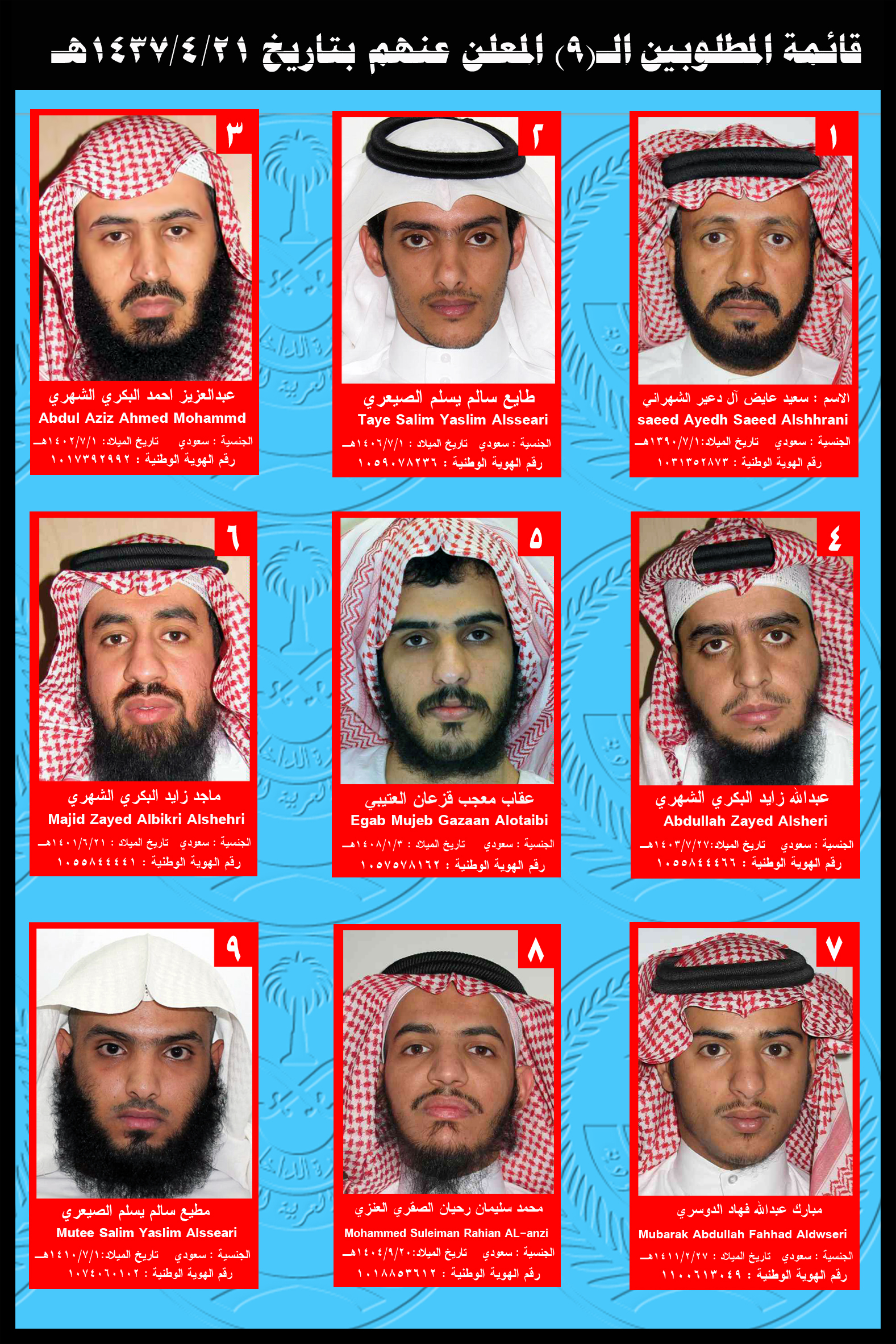 8. محمد سليمان رحيان الصقري العنزي (سبق الإعلان عنه كمطلوب أمني ضمن قائمة 16 التي أعلن عنها بتاريخ 16 / 8 / 1436هـ).