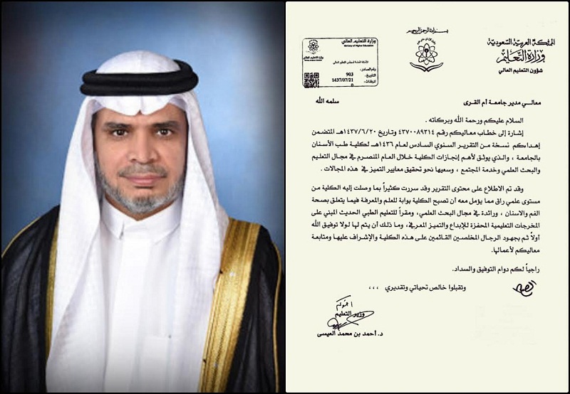 أشاد معالي وزير التعليم الدكتور أحمد بن محمد العيسى بالإنجازات التي حققتها كلية طب الاسنان بجامعة أم القرى خلال العام المنصرم في مجالات التعليم والبحث العلمي وخدمة المجتمع، وسعيها نحو تحقيق معايير التميز في هذه المجالات.