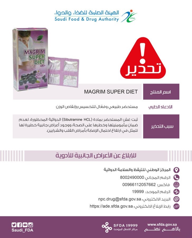 حذرت الهيئة العامة للغذاء والدواء من مستحضر (MAGRIM SUPER DIET)، الذي يروج له باعة متجولون ومواقع الكترونية على أنه مستحضر طبيعي وفعّال للتخسيس وإنقاص الوزن، في حين أنه غير مسجل لدى “الهيئة” ويحمل ادعاءات مضللة وجرى غشه بمادة دوائية محظورة.