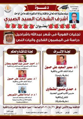 تشهد كلية الآداب بجامعة المنصورة في مصر يوم الاثنين القادم مناقشة رسالة الدكتوراة المقدمة من الباحث أشرف الشحات السيد الصيري بعنوان ” تجليات الهوية في شعر عبد الله باشراحيل دراسة في المضمون الفكري وآليات النص” وتتكون لجنة الإشراف على المناقشة من كل من الأستاذ الدكتور سمير السعيد على حسون استاذ النقذ الأدبي بالكلية مشرفا ورئيسا والاستاذ الدكتور احمد حسين سعفان مناقشا ورئيسا والدكتور حمدي منصور الطنطاوي مدرس الأدب العربي الحديث مشرفا مشاركا والاستاذ الدكتور سمير السعيد على حسون استاذ النقذ الادبي مشرفا وعضوا والدكتور اسامة لطفي الشوربجي استاذ الادب بجامعة الاسماعيلية مناقشا وعضوا.