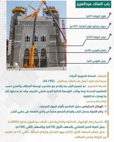 أطلقت وكالة المشاريع والدراسات الهندسية بالرئاسة العامة لشؤون المسجد الحرام والمسجد النبوي على مواقع التواصل الاجتماعي وسمًا بعنوان #عمارة_المسجد_الحرام، تستعرض فيه بعض المشاريع التي شهدها المسجد الحرام ، وتبدأ الوكالة بعرض مشروع باب الملك عبدالعزيز الذي روعي في تصميمه (منسوب) توسعة المطاف والصحن وتصاميمها الجديدة وتحديثهما بآخر ما توصلت إليه التقنية الحديثة لمواكبة التوسعة الحالية للحرم المكي الشريف وما تشهده من تطورات متسارعة بدعم لا محدود من القيادة الرشيدة – أيدها الله – ، واستخدمت رئاسة شؤون الحرمين في رخام الباب هياكل الستاينلس المكسوة بألواح البرونز المزخرف ورخام الكرارة بمدخل الباب والرخام المصنع محلياً من وادي فاطمة على جانبي الباب، كما تجاوز رخام الواجهات الداخلية والخارجية لباب الملك عبدالعزيز (3000م) ، كما بلغ كمية الحجر الصناعي بالسقف الأول (210م) وبالسقف الثاني (150م)، وارتفاع السقف الأول (22م) ببهو المدخل وارتفاع السقف الثاني (13م) بالممر بين البوابة وصحن المطاف, فيما بلغت نسبة إنجاز تنفيذ أعمال باب الملك عبدالعزيز (45.15%) من إجمالي أعمال الباب الواقع في الساحة الجنوبية (أجياد) للمسجد الحرام.