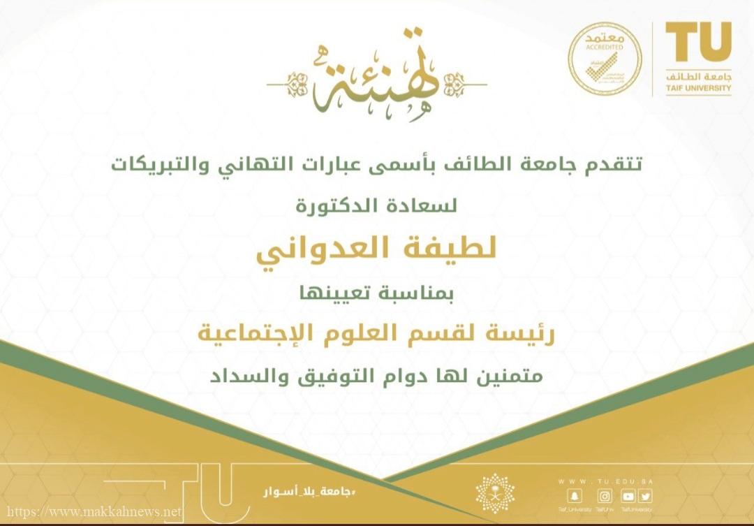 الطائف : صدر قرار من سعادة رئيس جامعة الطائف أ.د/يوسف عسيري بتكليف الدكتورة لطيفة العدواني رئيسة لقسم العلوم الاجتماعية بكلية الاداب بجامعة الطائف .