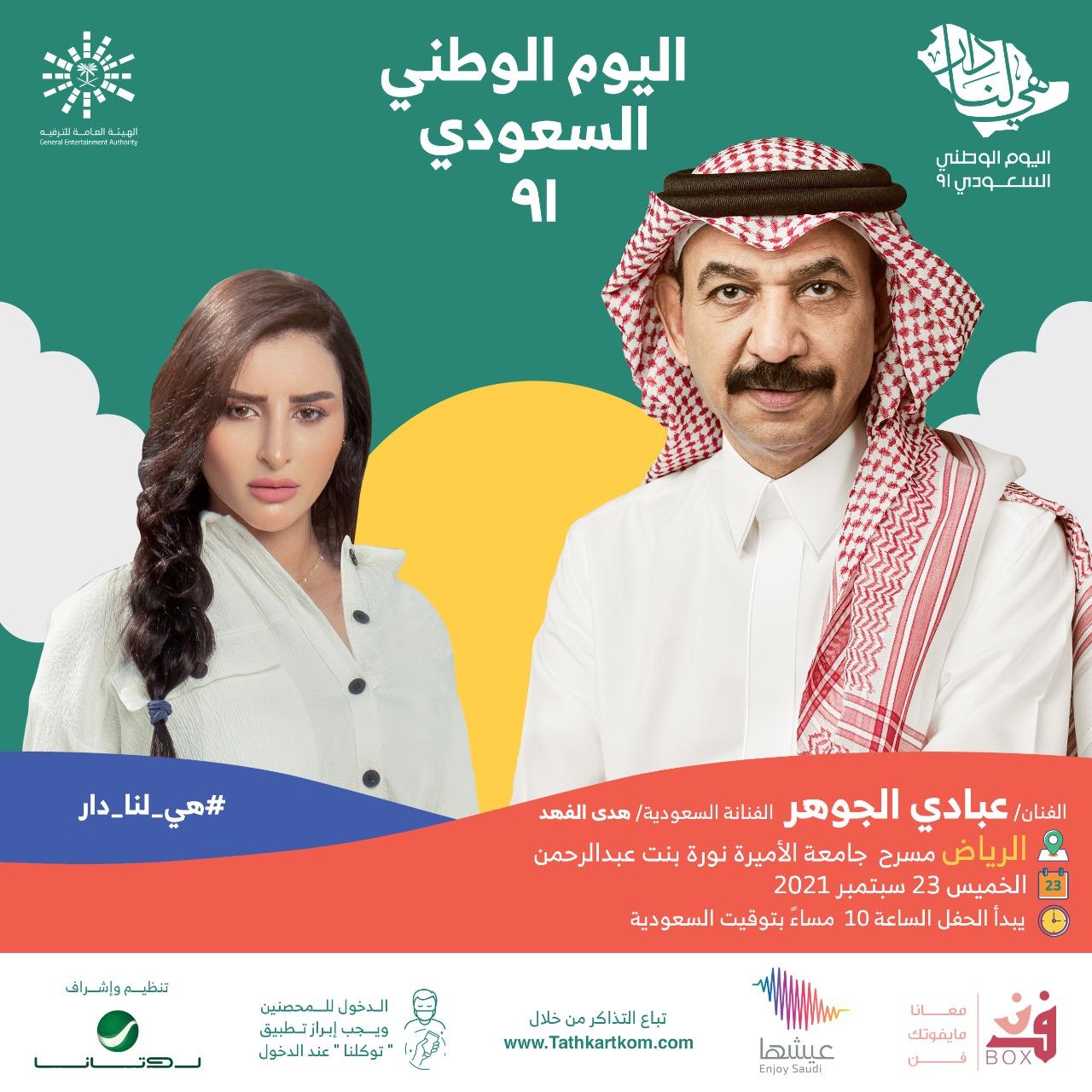 اقبال جماهيري كبير ، مصحوب بتجهيزات ضخمة جار العمل فيها على قدم وساق لاجل انجاح الحفل الضخم والمميز الذي سيقام برعاية الهيئة العامة للترفيه في المملكة العربية السعودية، من تنظيم واشراف هرم شركات الانتاج روتانا للصوتيات والمرئيات وذلك احتفاء بمناسبة “اليوم الوطني السعودي 91 ” الغالية على القلوب، وهو الحفل الذي يحيه النجم عبادي الجوهر، وتشاركه فيه الفنانة السعودية هدى الفهد.