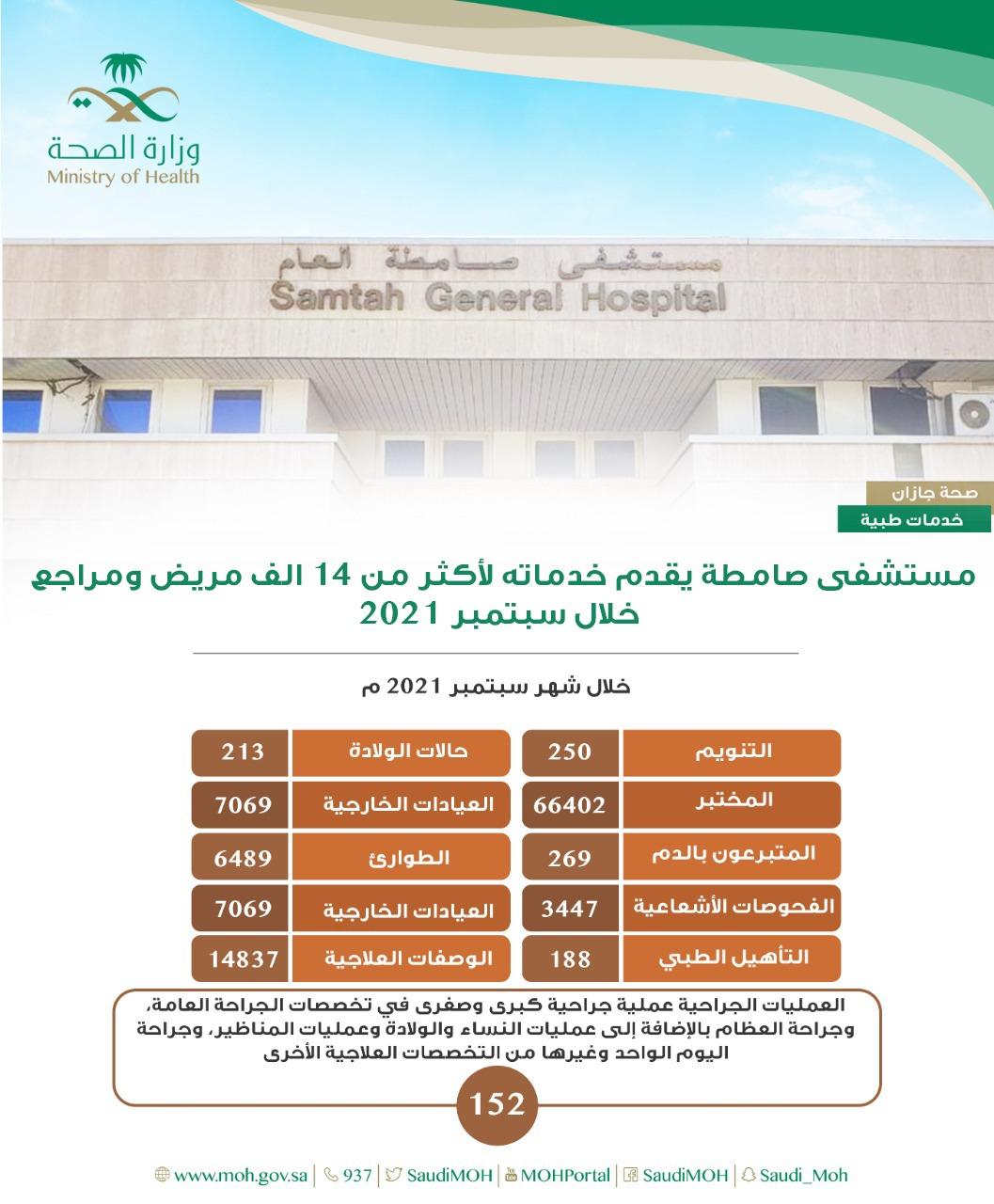جازان : قالت صحة جازان بأن مستشفى صامطة العام قدم خدماته العلاجية لأكثر من ” 14 ”ألف مريض و مراجع خلال شهر سبتمبر من هذا العام 2021 حيث بلغ عدد مرضى قسم الطوارئ “6489” مريض ، في حين بلغ عدد المراجعين بالعيادات الخارجية “7069 ” مراجع .