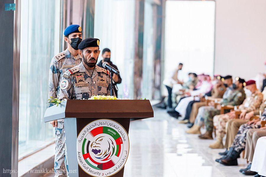 وبدأ الحفل باستعراض معاليه للقوات الأمنية المشاركة، ثم التوجه لمنصة الحفل حيث بدأ الحفل الخطابي بآيات من القرآن الكريم، تلى ذلك كلمة لقائد التمرين اللواء الركن شايع بن سالم الودعاني أكد فيها اكتمال الاستعدادات وجاهزية القوات المشاركة لانطلاق التدريبات والفرضيات المشتركة والتي تهدف إلى تعزيز أواصر التعاون بين دول مجلس التعاون الخليجي في المجال الأمني، ورفع مستوى التنسيق ودرجة الاستعداد والجاهزية للأجهزة الأمنية للتصدي لجميع التهديدات والمخاطر التي تتعرض لها منطقة الخليج العربي.