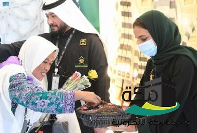 وفور وصول الحجاج إلى مدخل المطار استقبلوا بباقات الورود، وأطباق متنوعة من التمور إضافة لعبوات ماء زمزم.