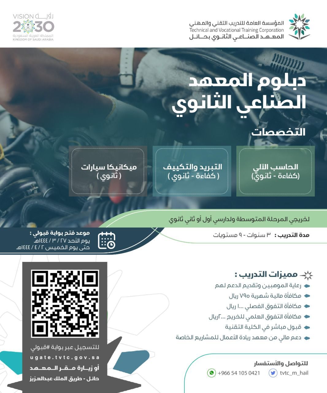 أعلن المعهد الصناعي الثانوي بمنطقة حائل عن فتح باب القبول والتسجيل لبرامج الدبلوم والبرامج المهنية، للفصل التدريبي الثاني لعام 1444هـ، وذلك بداية من يوم غدٍ الأحد 27 / 3 / 1444هـ عبر بوابة القبول والتسجيل الموحدة بموقع المؤسسة العامة للتدريب التقني والمهني التالي: