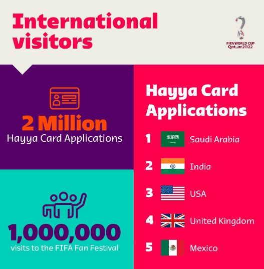 أعلنت اللجنة المنظمة لبطولة كأس العالم عن اصدار حتى هذه اللحظة مليونين بطاقة هيا لحضور مونديال قطر 2022 وجاءت المملكة العربية السعودية في المركز الأول كأكثر الدول استخراجا للبطاقة.