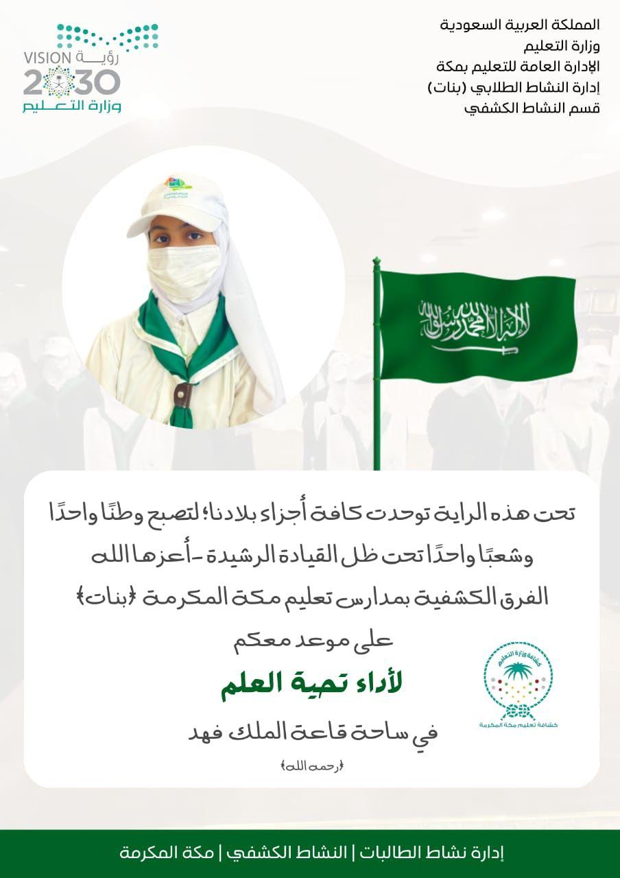 قامت فتيات الفرق الكشفية والتابعة لكشافة تعليم مكة المكرمة، بآداء تحية العلم ، وذلك بقاعة الملك فهد للمناسبات بمقر ادارة تعليم مكة، بحضور كلا من مساعدة مدير تعليم مكة للشؤون التعليمية -بنات- لمياء عبدالعزيز بشاوري، ومديرة ادارة نشاط الطالبات بتعليم مكة، الدكتورة ليلى سعد الصاعدي.