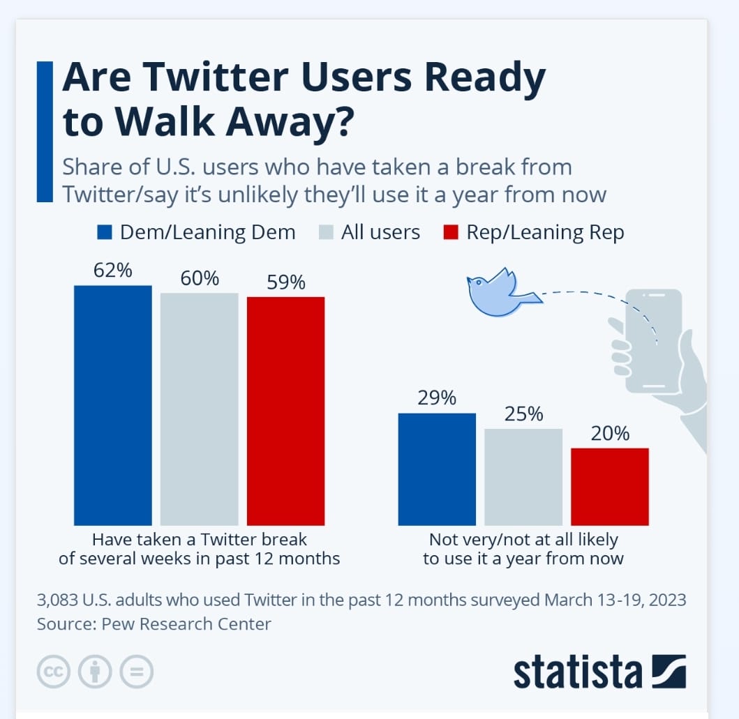 ووفقاً لما ذكره مركز بلحوث البث 60% من ما يقرب من 3000 مستخدم في الولايات المتحدة قالوا أنهم أخذوا استراحة عن تويتر لمدة أسبوعين على الأقل في الأشهر الاثنتي عشرة الماضية، ولكن فقط 25% من المجيبين على استطلاع الدراسة قالوا أنهم لايتخيلون أنفسهم بدون منصة تويتر بعد عام من الآن.
