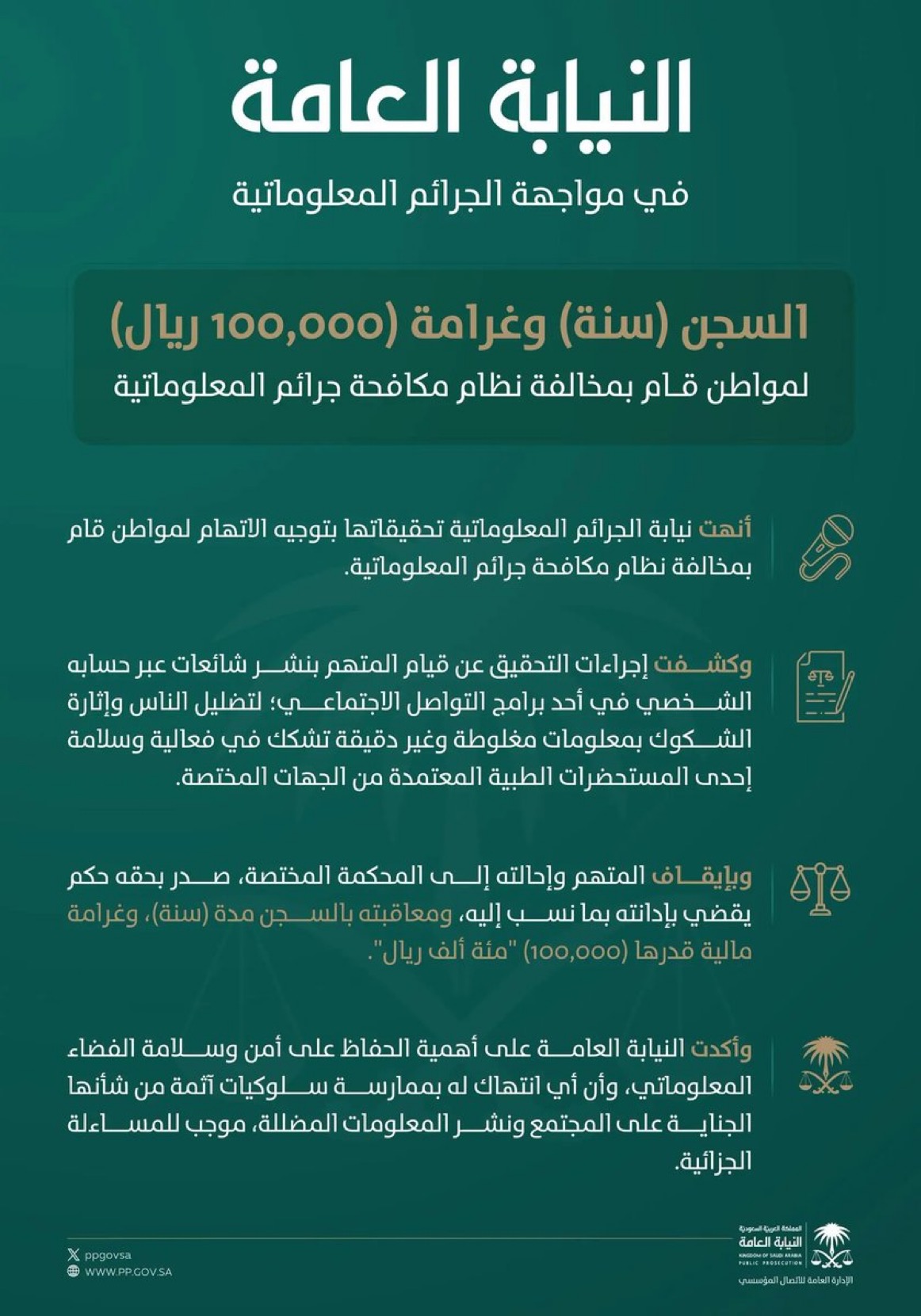 وأكدت النيابة العامة على أهمية الحفاظ على أمن وسلامة الفضاء المعلوماتي، وأن أي انتهاك له بممارسة سلوكيات آثمة من شأنها الجناية على المجتمع ونشر المعلومات المضللة، موجب للمساءلة الجزائية.