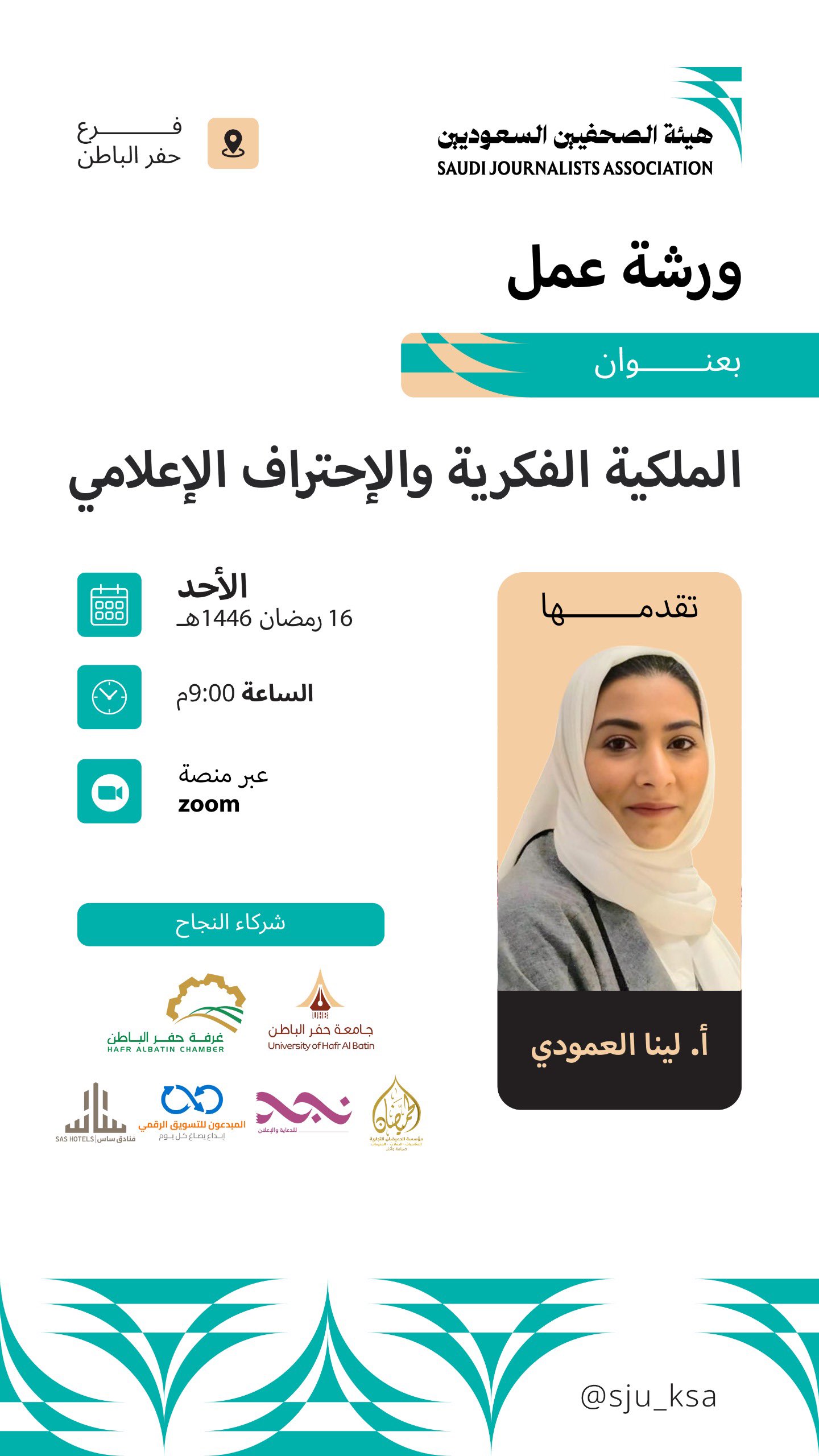 يعتزم فرع هيئة الصحفيين السعوديين بحفر الباطن تنظيم ورشة عمل بعنوان: “الملكية الفكرية والاحتراف الإعلامي” والتي تقدمها الأستاذة لينا العمودي.