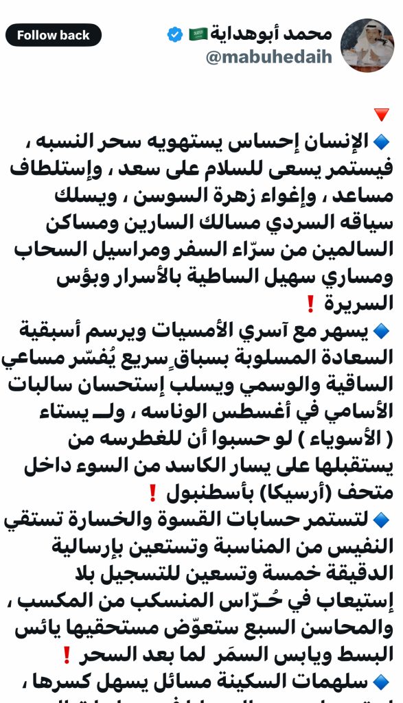 أبدع الكاتب والإعلامي محمد أبوهداية في نص أدبي جديد حمل لمسة من السحر اللغوي، إذ صاغ مقاطع نثرية تنبض بالإيقاع الداخلي، وتستحضر صورًا متلاحقة تستند إلى تكرار الحروف، واستدعاء الرموز، وتوظيف السجع في مقاطع متوالية.