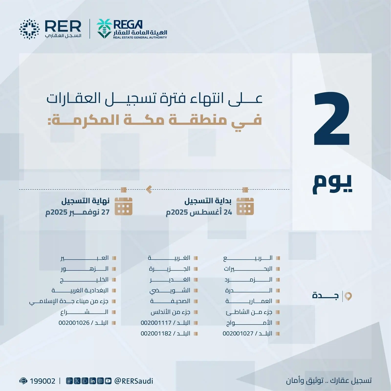 أعلنت الهيئة العامة للعقار عن قرب انتهاء المهلة المحددة للتسجيل العيني الأول للعقار لـ(54,062) قطعة عقارية في (4) أحياء بمنطقة مكة المكرمة في محافظة جدة، و(32) حيًا في محافظة الأحساء و(10) أحياء في محافظة الجبيل، و(10) أحياء في محافظة رأس تنورة بالمنطقة الشرقية، وذلك بنهاية يوم الخميس 6 جمادى الآخر 1447هــ، الموافق 27 نوفمبر 2025م.
